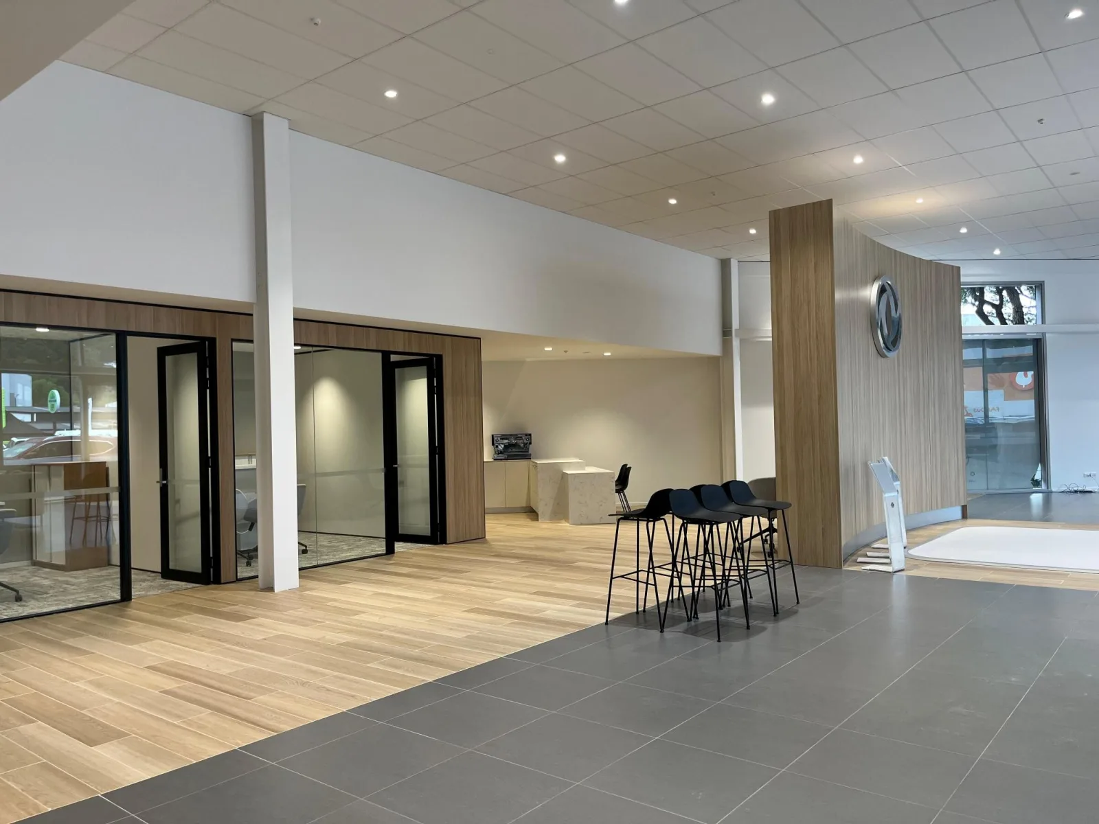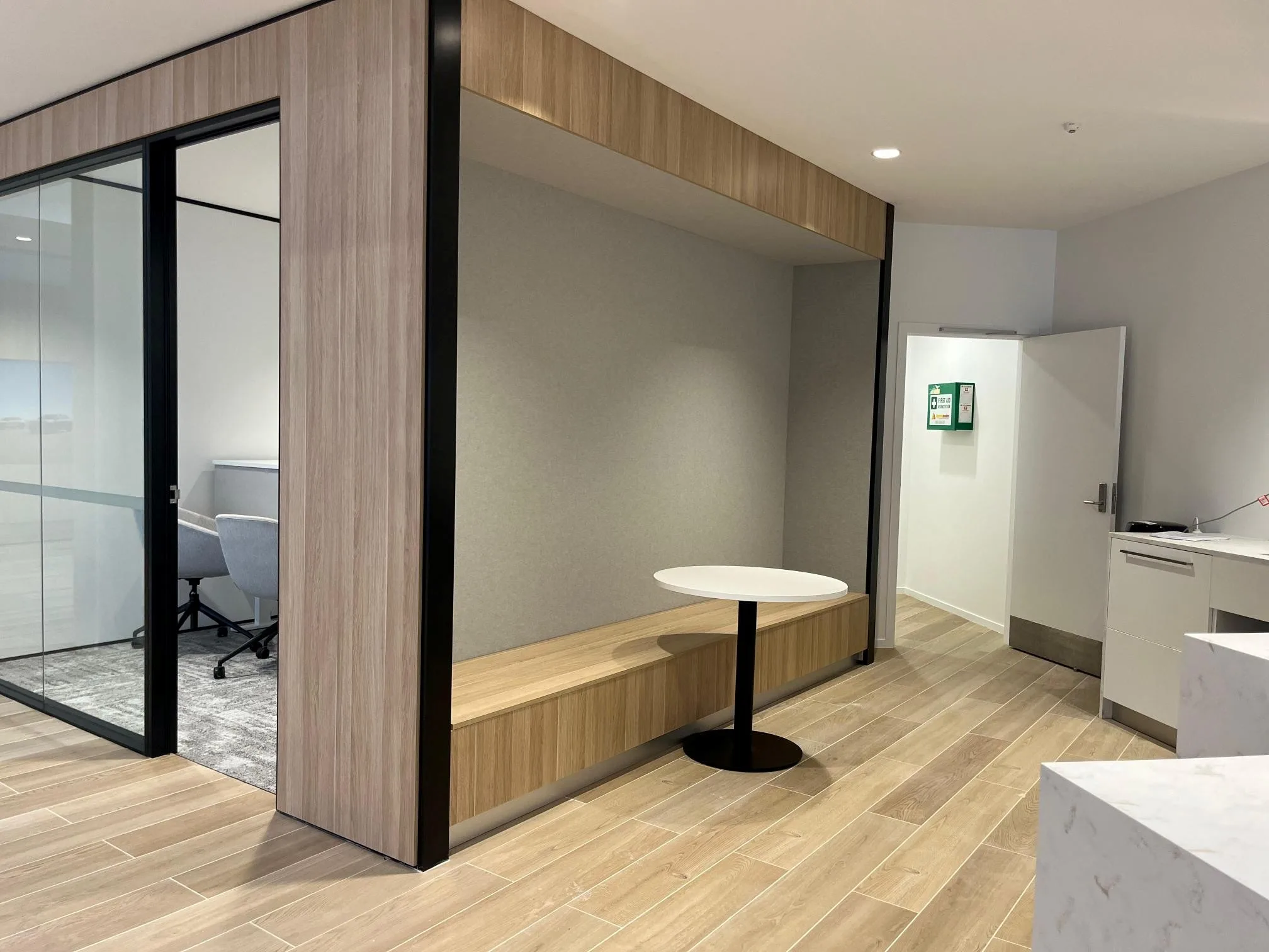 This fit-out included new wood-look ceramic tiles, a new kitchenette complete with appliances, custom built-in joinery, feature wall panelling, two new office spaces, updated soft flooring and wall finishes, and a full interior repaint to bring the space together.