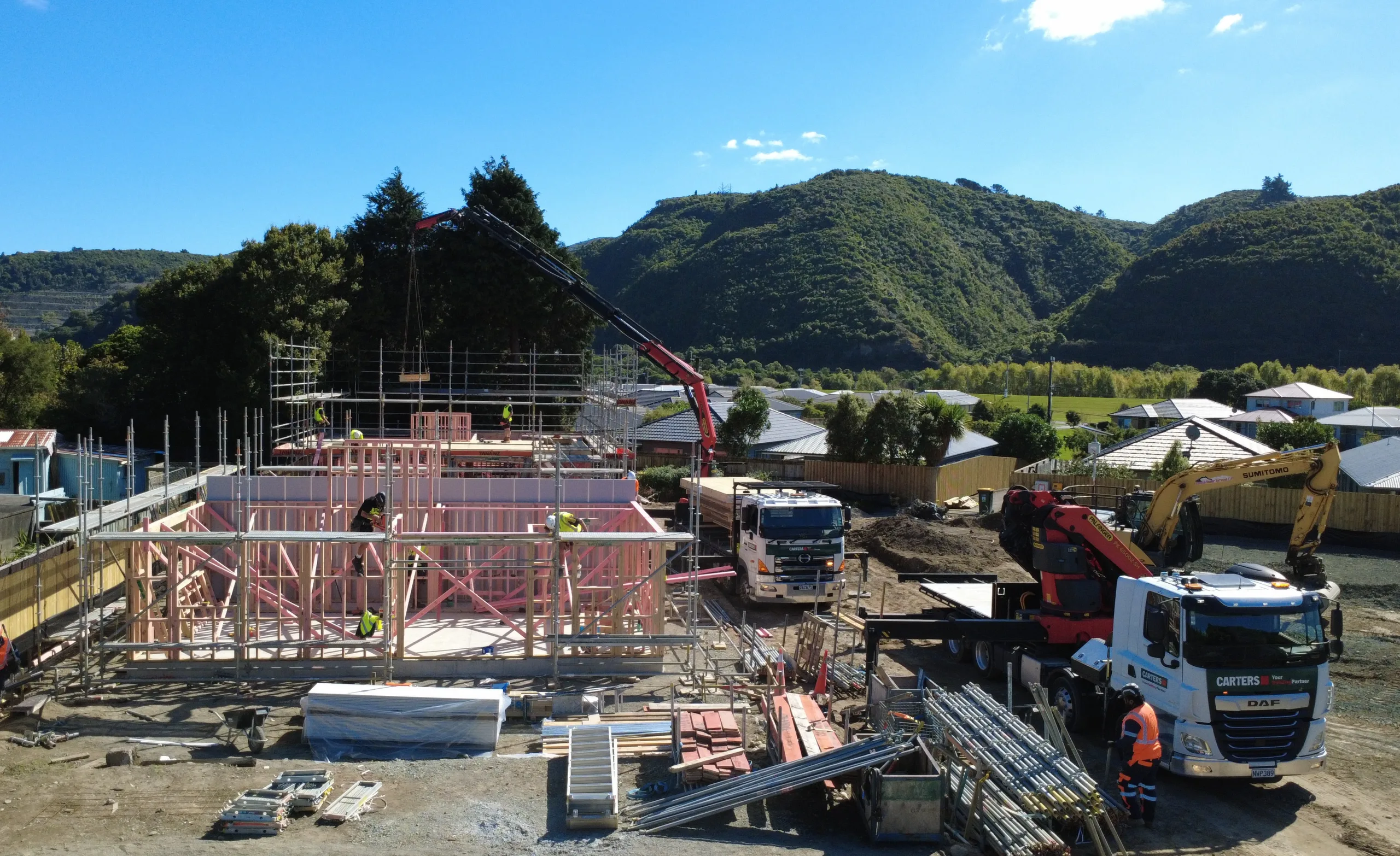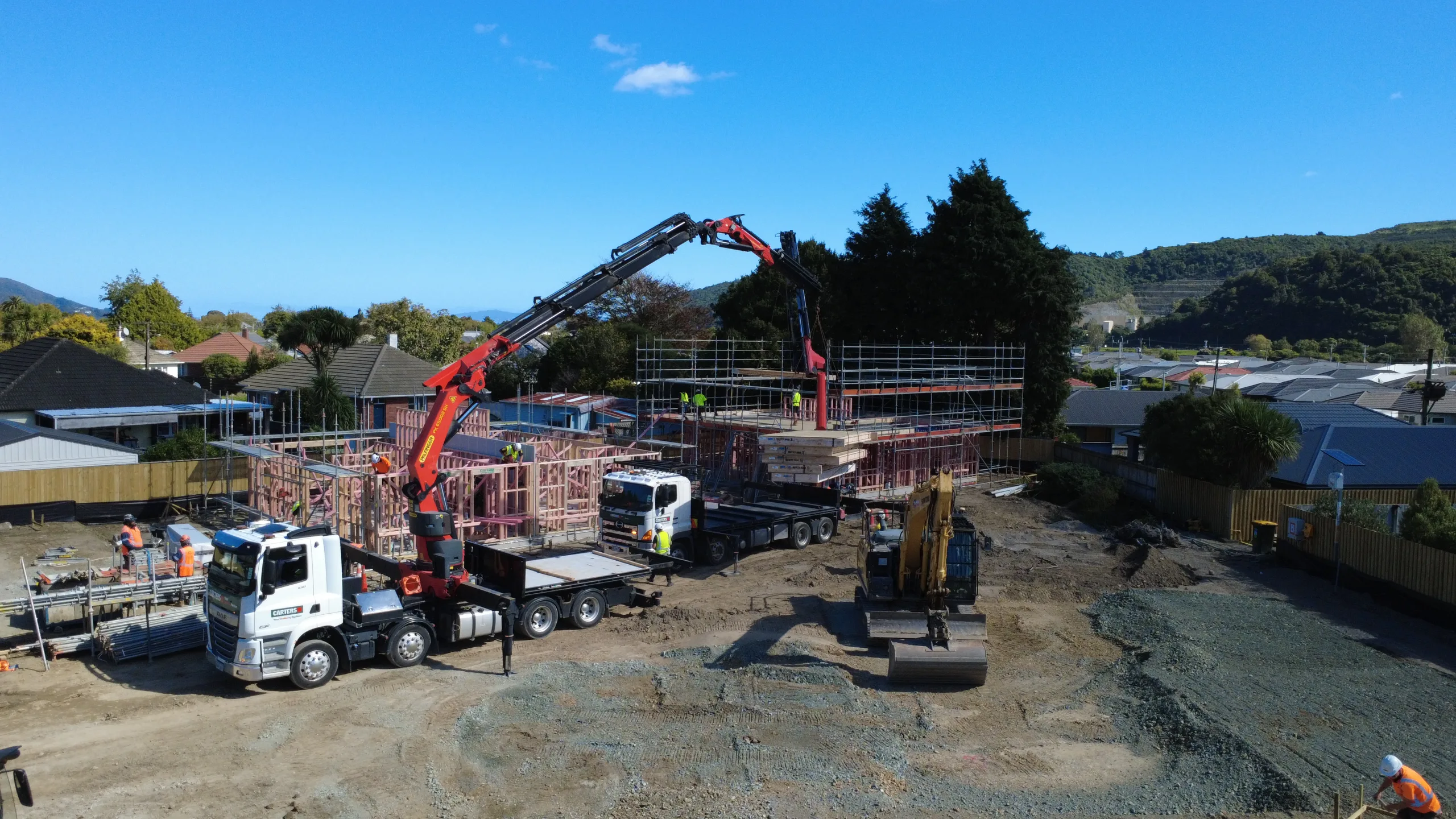 Excavation for all nine foundation slabs is complete, with four duplex slabs already poured. Installation of the under-slab drainage is underway ahead of the remaining pours. The prenailed frames for the first duplex are now standing with additional units set to follow quickly.