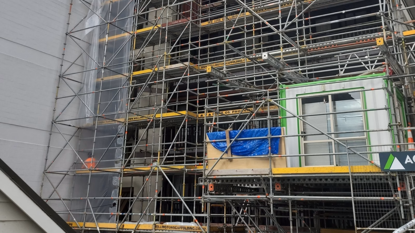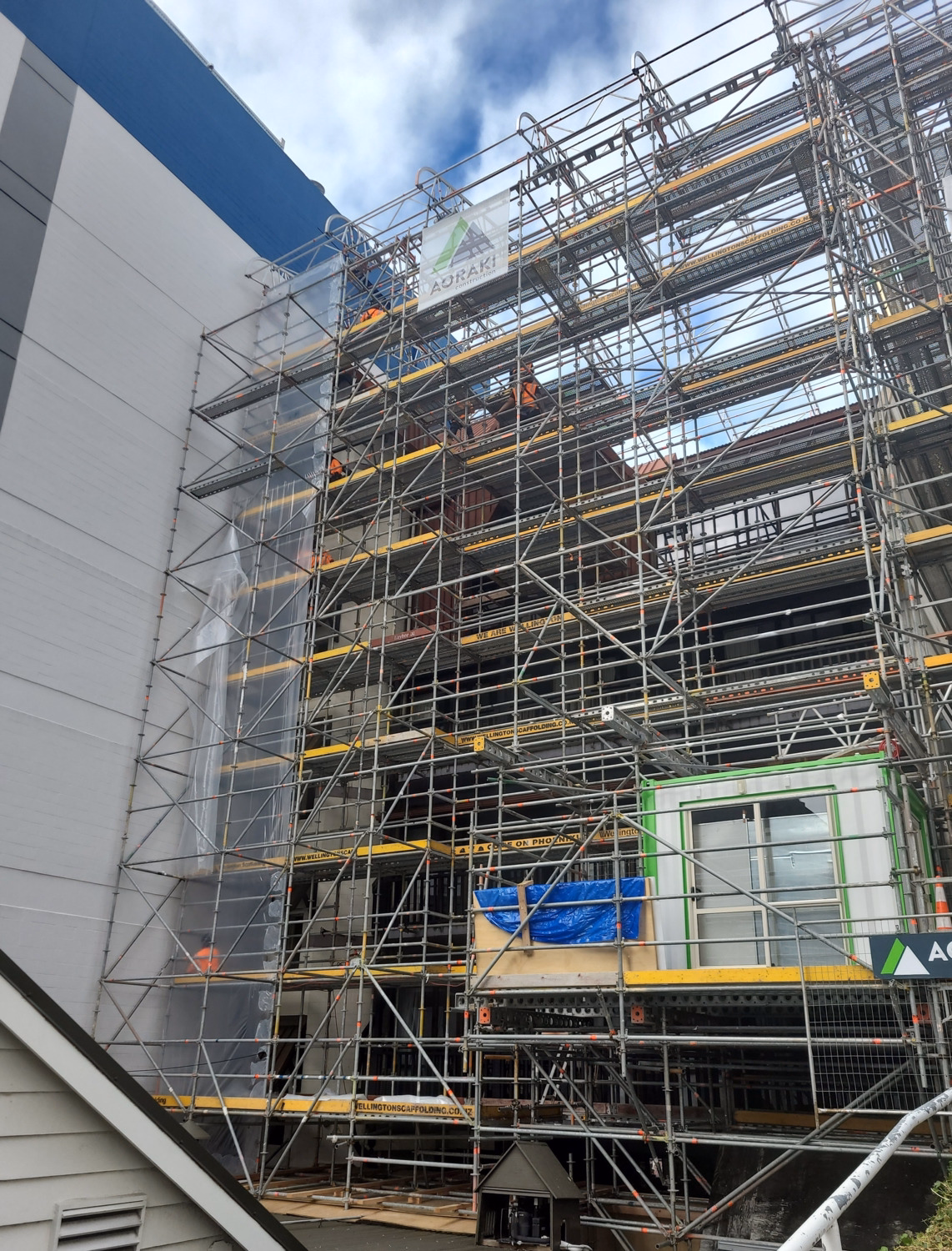 In order to prepare the building for the refurbishment works we first needed to scaffold the perimeter, erect temporary scaffold roof trusses, and apply shrink wrap to the scaffold from the roof down to the ground floor. As the building is to remain occupied throughout the works, translucent shrink wrap has been used over the existing window openings to allow light through to the apartments.