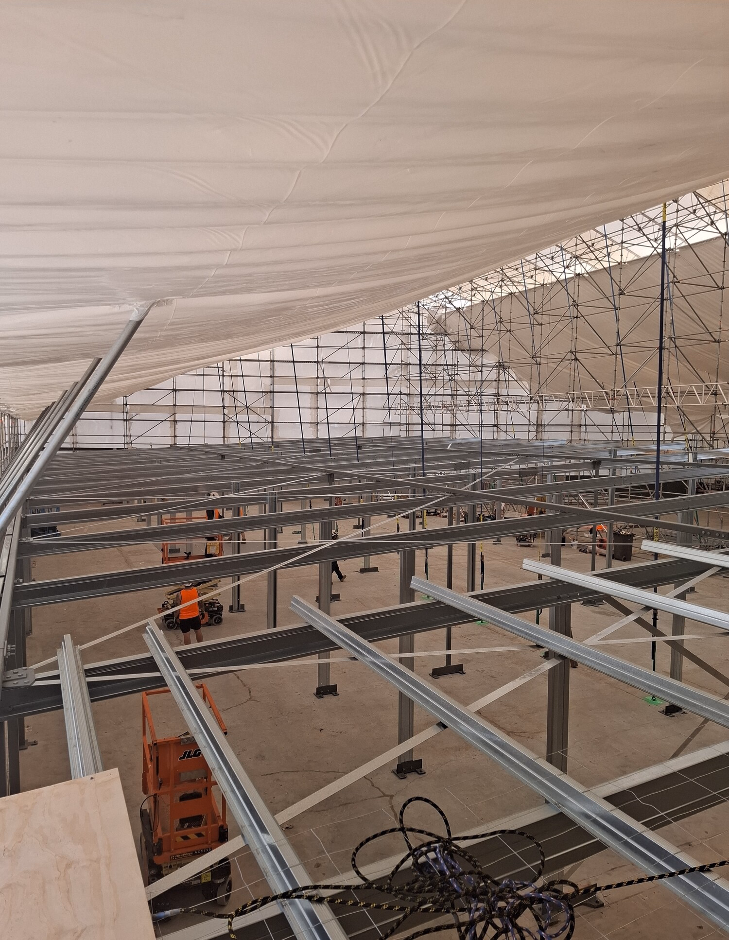 We have broken the project down into 4 areas to enable us to stage the works around the temporary tent and propping structure of this large (3,200m2 footprint) building. To give an idea of scale, we will be bringing in 30 tonnes of new structural steel into the building, and the long run roofing is coming in at lengths up to 25m long!