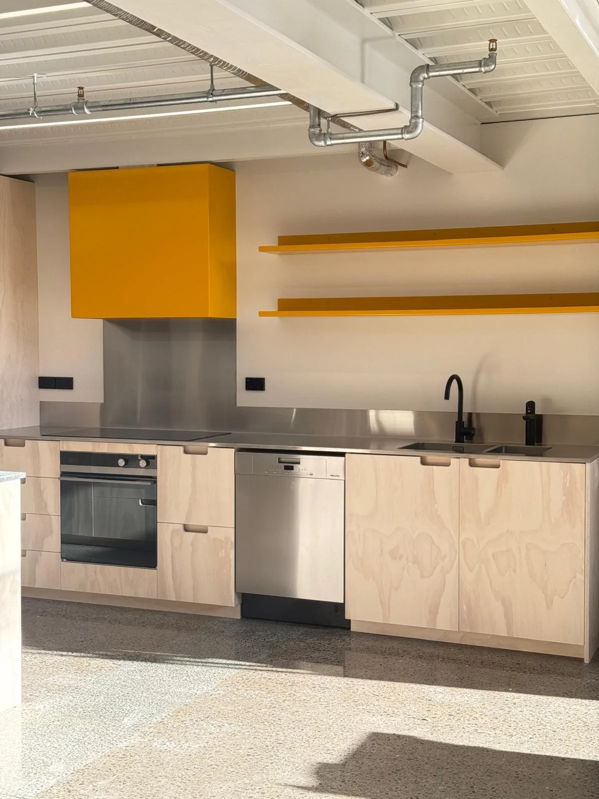 The project involved a total strip-out to bare bones, construction of a new concrete mezzanine floor, new roof structure and insulated roof with skylights and clerestory windows; new aluminium window and door joinery, and a façade refresh.