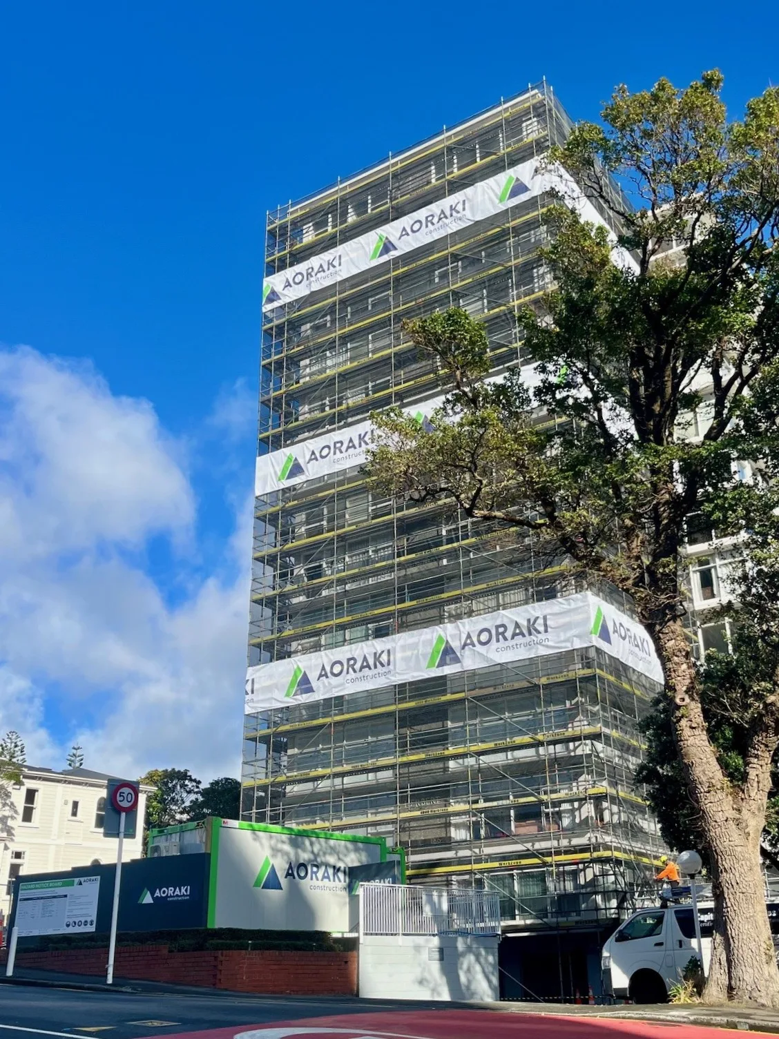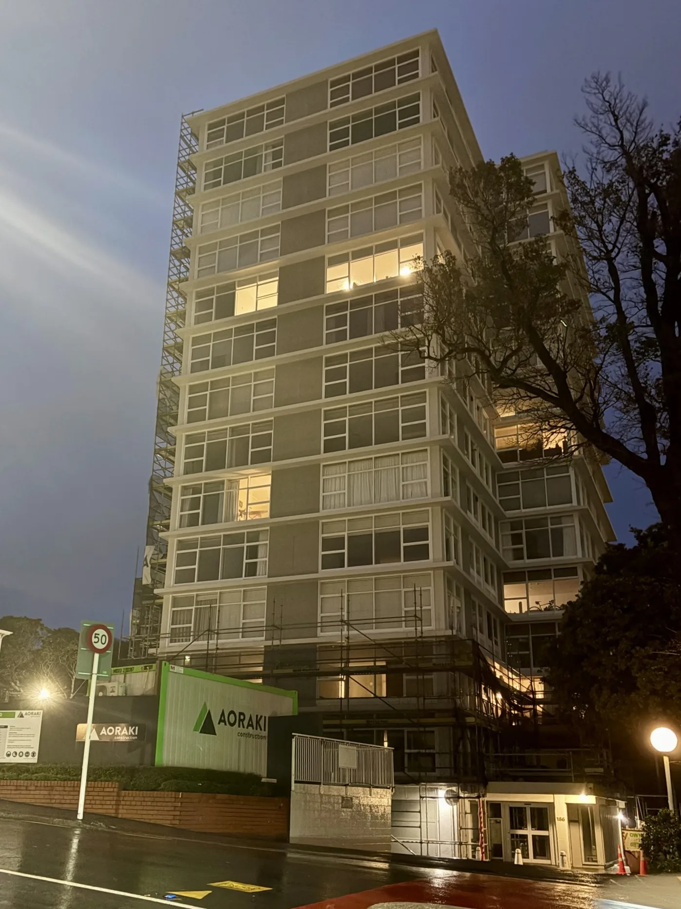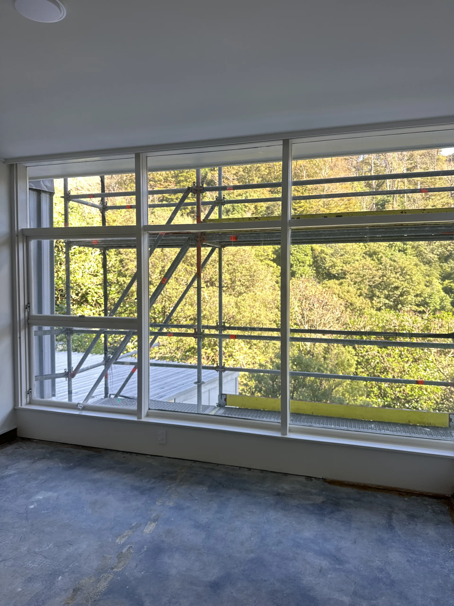 The building has three main service risers, each of which will undergo safety upgrades. These include fire-rating improvements, relocation of services, and the installation of safe working platforms and access points. Perimeter scaffolding is being erected across all elevations, to provide access for window remediation, weathertightness improvements, and full repainting of all timber joinery, pre-cast panels and concrete aprons.